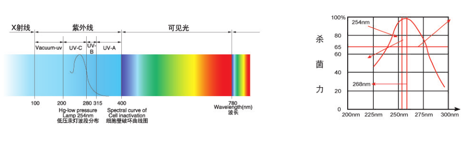 紫外線是介于可視光線和X射線之間的電磁波頻譜。200nm至400nm的紫外光譜有很強(qiáng)的殺菌效力, 其峰值在265nm。 在這個(gè)波長范圍內(nèi)的紫外線主要是通過刺穿細(xì)胞膜,破壞細(xì)胞內(nèi)脫氧核糖核酸和破壞細(xì)胞內(nèi)的其它分子,使微生物不能再復(fù)制和繁殖,而最終達(dá)到消毒作用。 紫外線殺菌器實(shí)物拍攝依照波長范圍,可將紫外線分為4個(gè)波段: